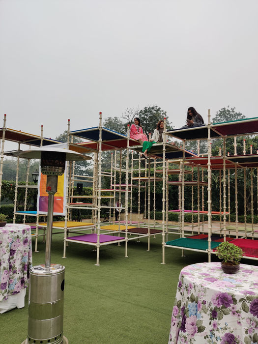 The Charpai installation made as a part of the project, is a playful interpretation of this idea .The installation brings together multiple aspects of the charpai, from the techniques and patterns of weaving on the loom, to its portability. An abstract reference to the game of snakes and ladders, the installation instigates play around spaces that suggests interaction, and a lazy afternoon perched amongst the trees.