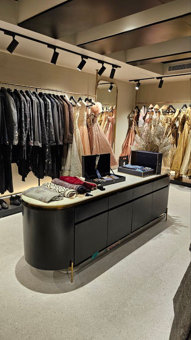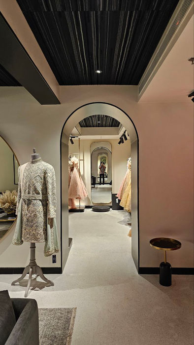 This 1800 sq.ft. space is envisioned as a couture den—a sanctuary of style that blurs gender lines and glorifies Indian identity through an architectural lens. Every design decision was anchored in their core values: sartorial strength, sculptural simplicity, and narrative depth. The store doesn’t just display fashion—it sets the stage for it. Clean geometries, dramatic contrasts, and elemental materials become a backdrop for the bold silhouettes that define Shantanu & Nikhil’s couture universe.